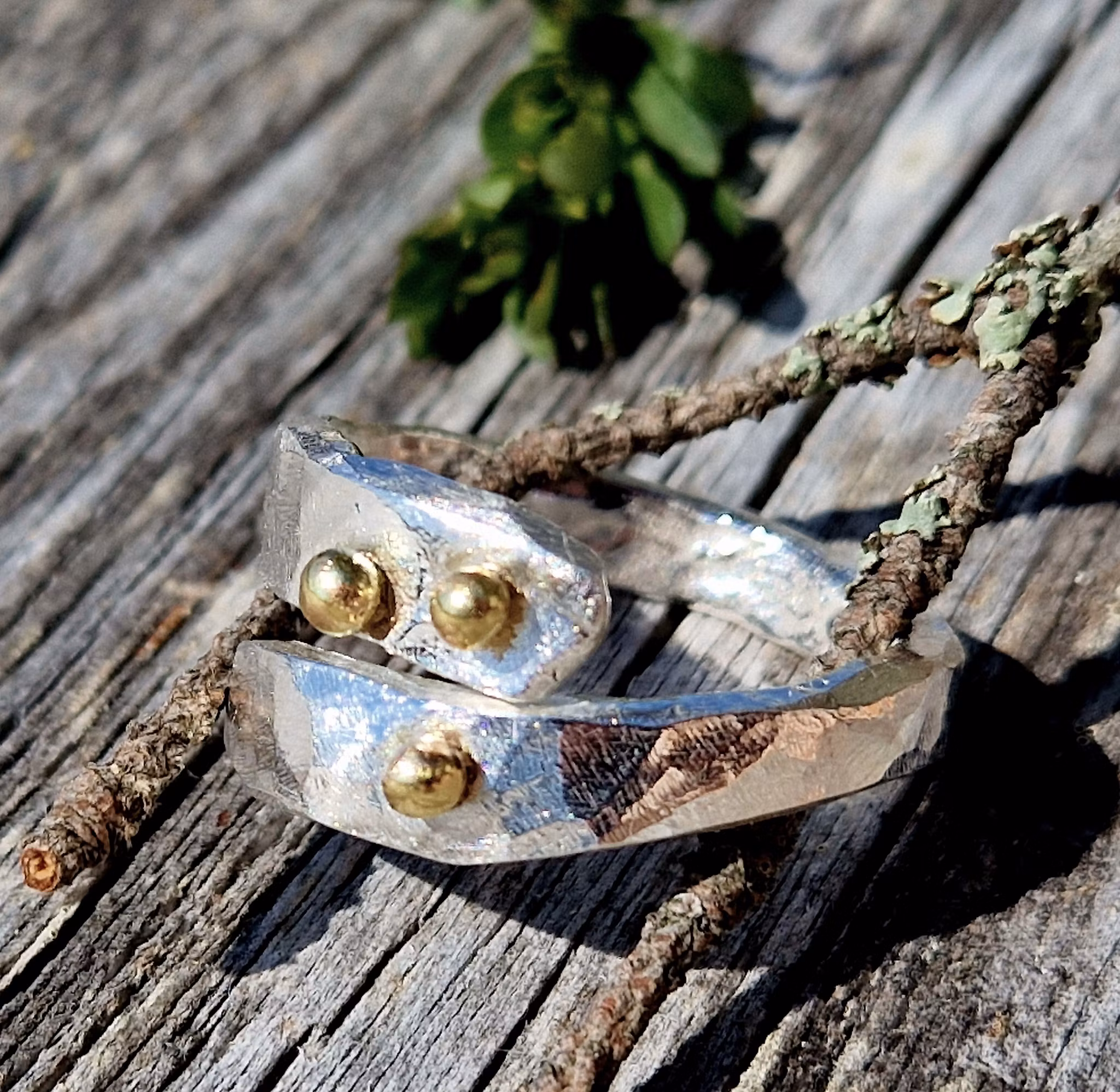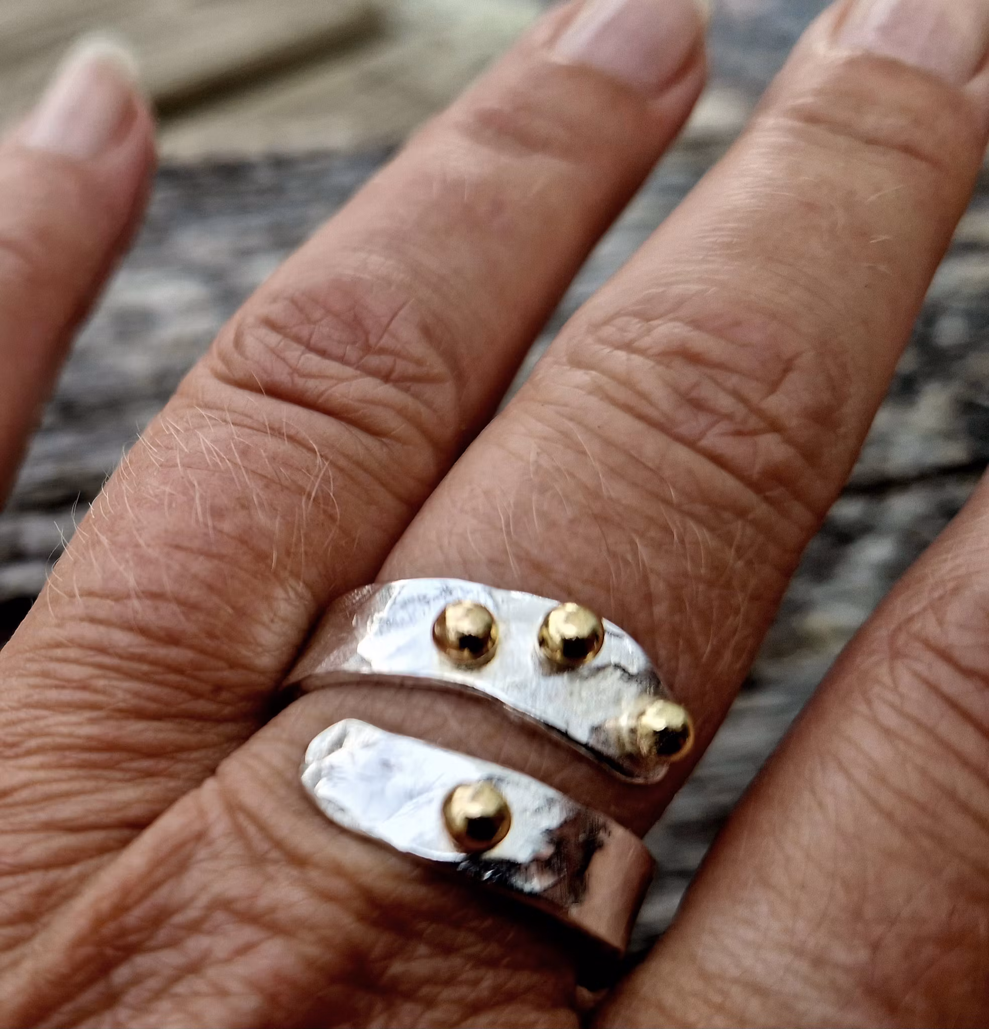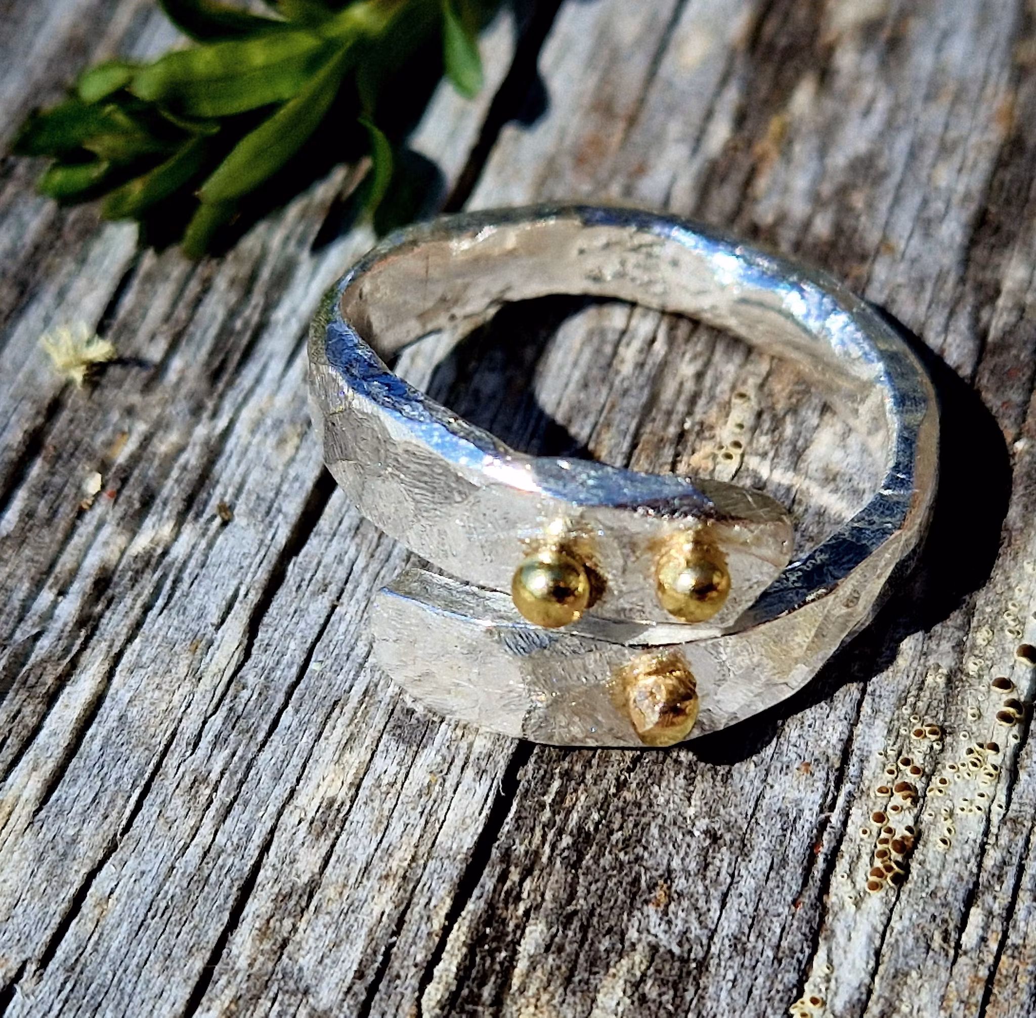 Den här unika ringen är tillverkad av 925 silver och 18K guld, och har en kula för varje barn. Den är hamrad och gjord omlott, så den passar de flesta fingrar och kan ställas in eller ut. Ett extra plus är att om det blir tillkommer fler barn senare, kan du lämna in din ring så lägger vi till fler guldkulor.