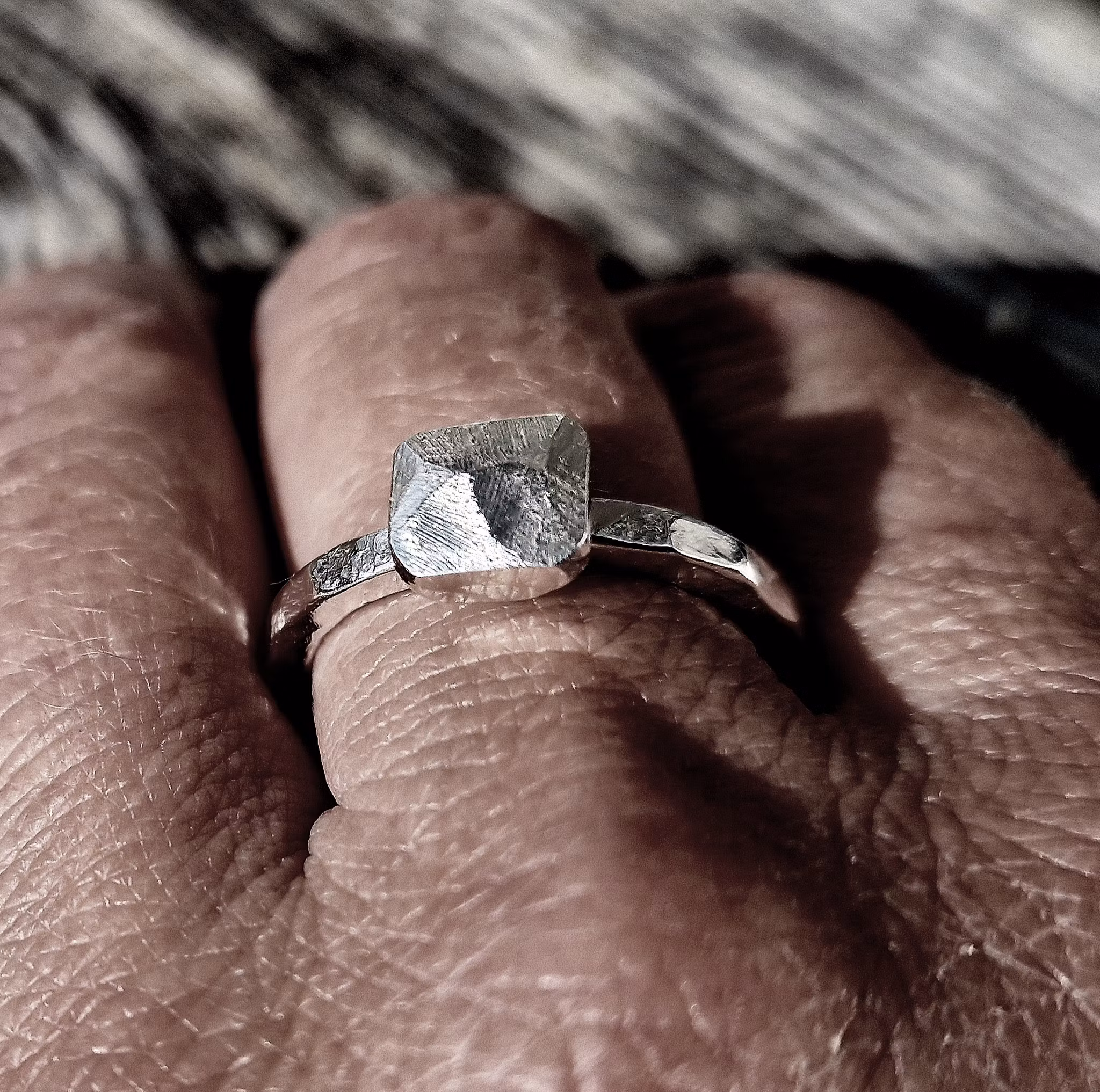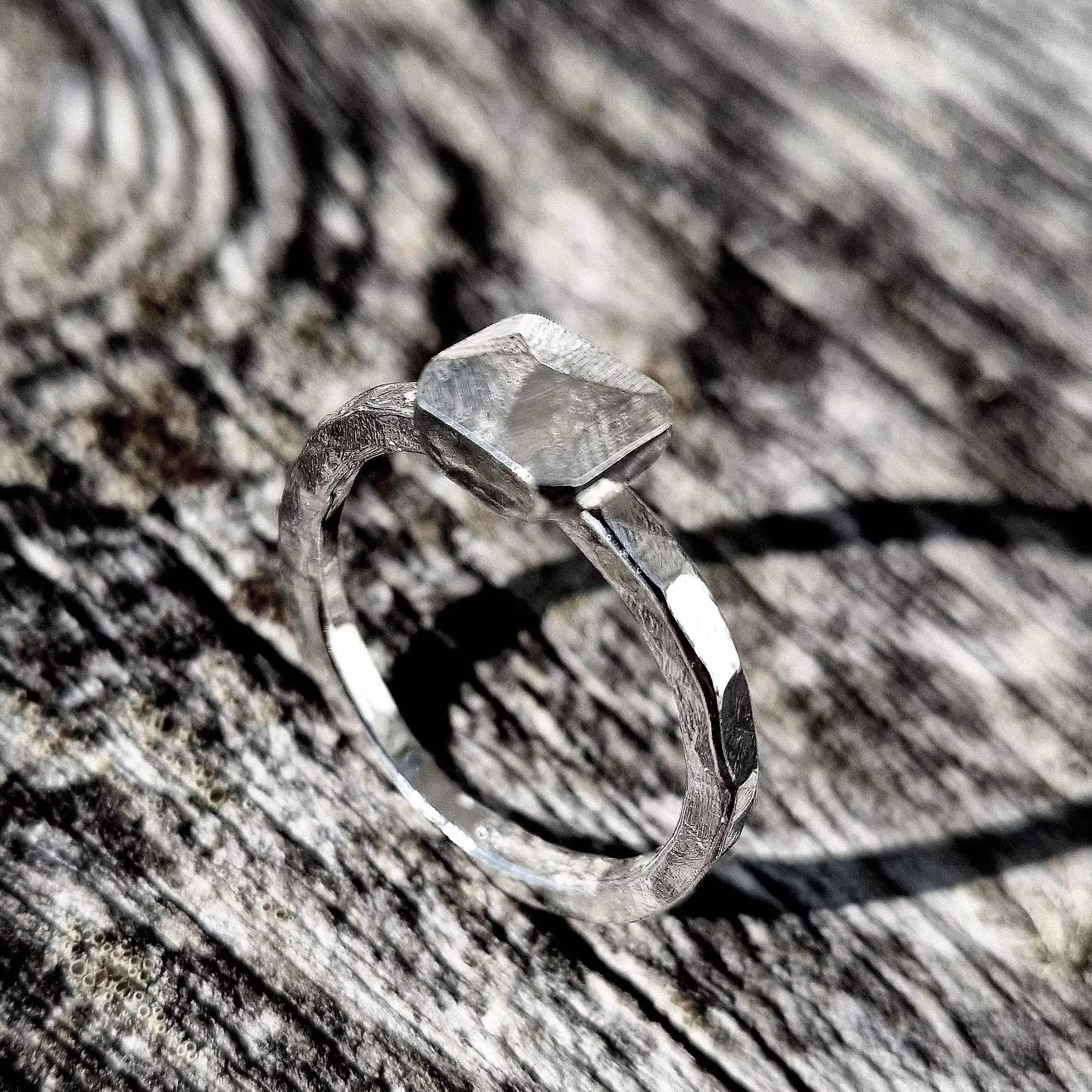 Rock #3 I lager. 840 kr LÄGG I KORGEN Rock har en fyrkantig sten med snygga slipningar som ger glans och lyster. Ringen är hamrad vilket ger den fina fasetter. Diameter 18,5 mm.