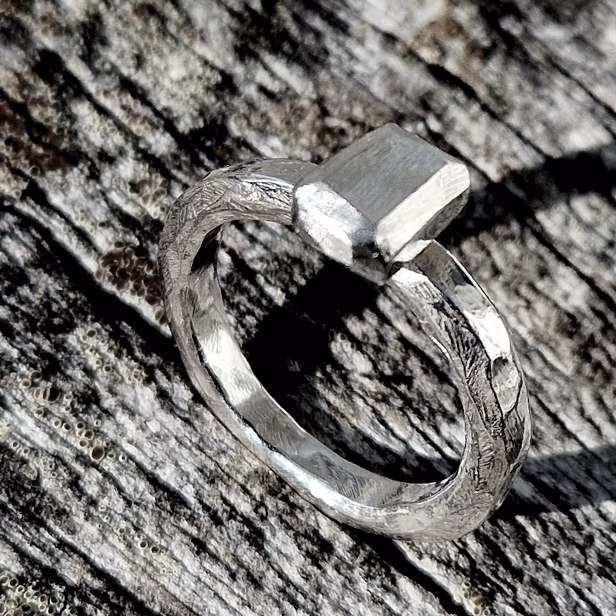 Rock #4 I lager. 740 kr LÄGG I KORGEN Rock har en kantig sten med snygga slipningar och fasetter som ger glans och lyster. Ringens yta är hamrad.Diameter 16 mm.